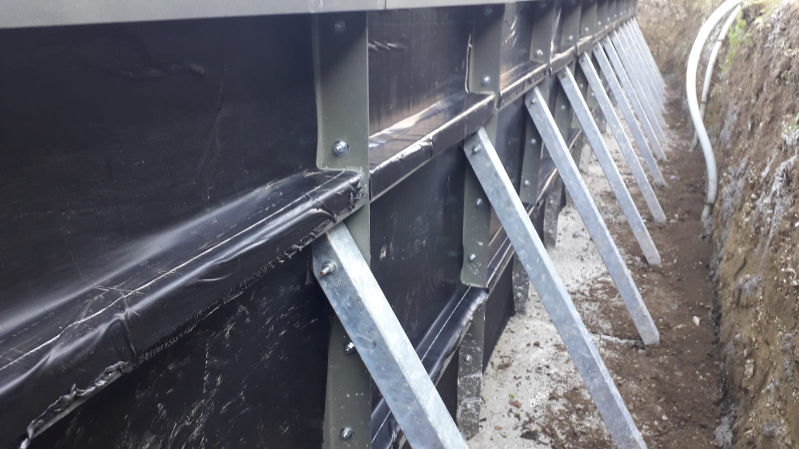 La struttura è composta da robustissimi pannelli in acciaio zincato di forma rettilinea. Questi pannelli sono realizzati tramite la lavorazione di una lamiera in acciaio spessa 20/10 mm, appositamente piegata per formare una struttura scatolare dallo spessore totale di 10 cm. Il collegamento tra i pannelli avviene tramite giunzioni imbullonate e con flange di unione poste nelle sagomature laterali di ogni pannello. Ogni pannello è assemblato con una serie di bulloni, dadi e rondelle in acciaio zincato. Questi, assieme ai contrafforti reggispinta, rendono la vasca capace di sopportare la pressione esterna del terreno e quella interna dell’acqua, permettendone una posa interrata stabile e resistente nel tempo. Il perimetro costituito da pannelli modulari è facile e veloce da assemblare. I pannelli dispongono inoltre di forature adatte al raccordo di accessori da murare come skimmer e bocchette, semplificando il posizionamento di questi raccordi periferici in fase di installazione della vasca.